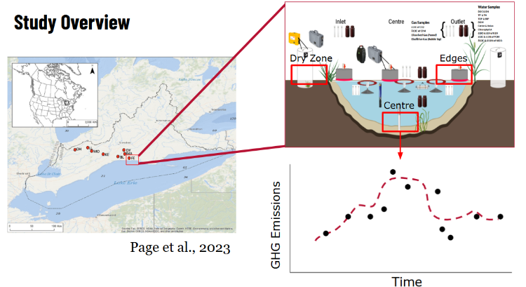 Many studies focus on either carbon storage or greenhouse gas emissions, but rarely assess both together as a full “carbon budget,” especially in Southwestern Ontario. Even fewer studies measure what happens at the edges of wetlands, where water levels fluctuate, creating hotspots for greenhouse gas emissions. Excluding these transition areas can lead to incomplete or misleading estimates of how much carbon wetlands store or release.