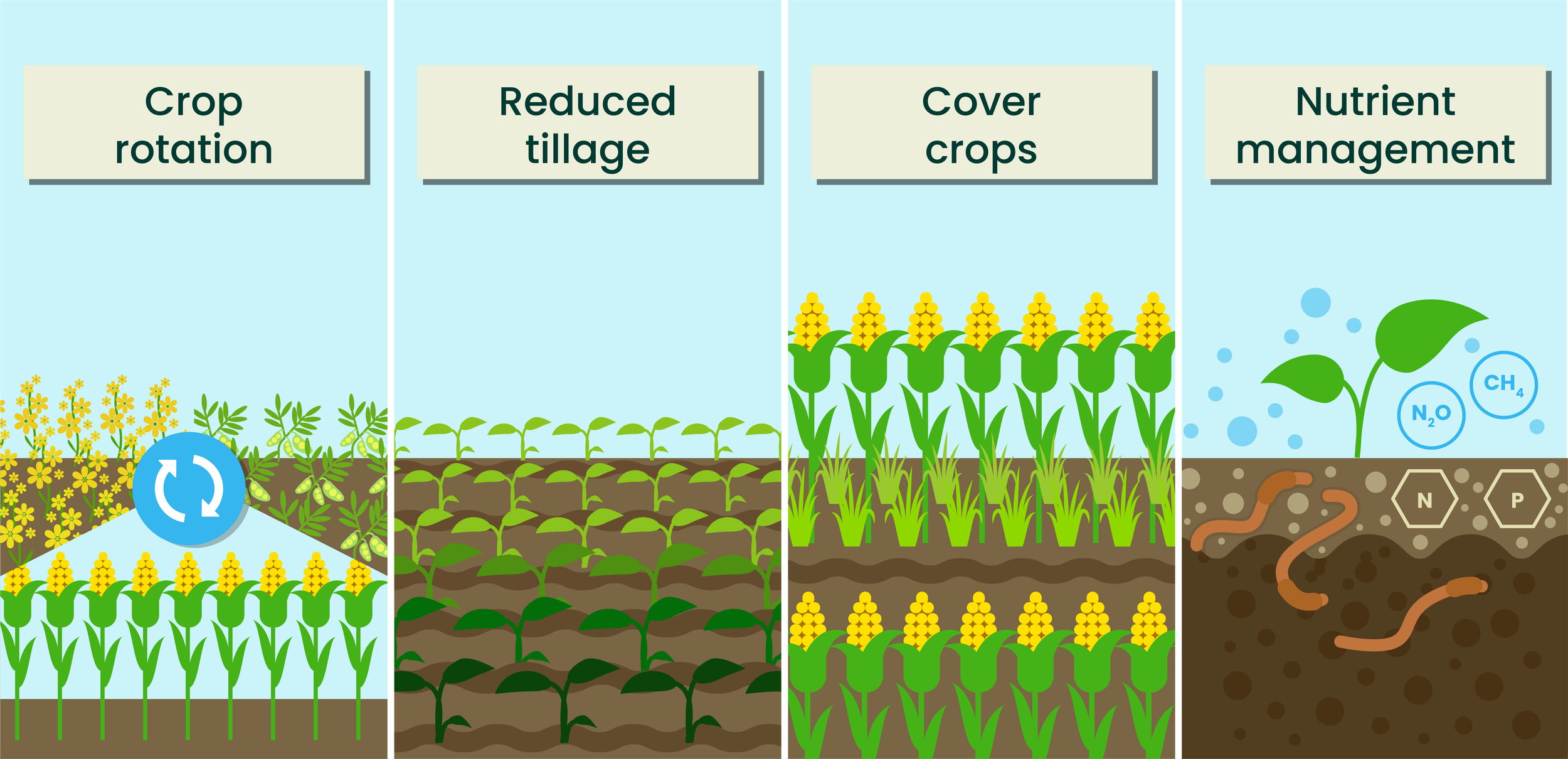 Practices like planting cover crops after crop harvest protects the soil from erosion, and can increase soil organic carbon storage. However, cover crops can also sometimes increase greenhouse gas emissions due to availability of easily degradable residues. Nitrogen management includes applying the right amounts, at the right time, and in the right place can reduce greenhouse gas emissions and nutrient leaching, while maintaining agricultural productivity.